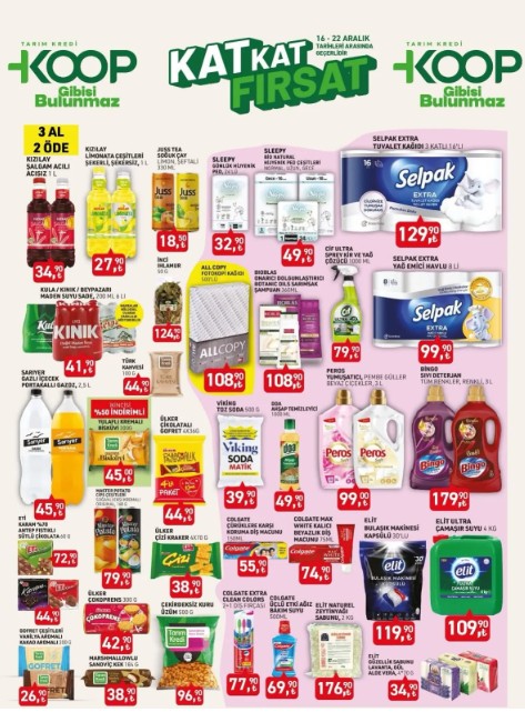 Tarım Kredi KOOP Market, 16–22 Aralık tarihleri arasında geçerli olacak yeni kampanyalarını duyurdu. Bu hafta özellikle temizlik ve hijyen ürünlerinde cazip indirimler ve çoklu alım fırsatları dikkat çekiyor.