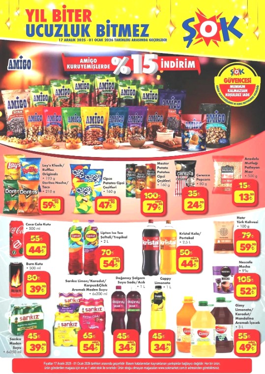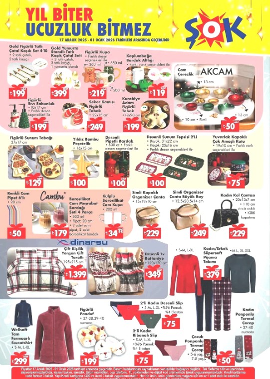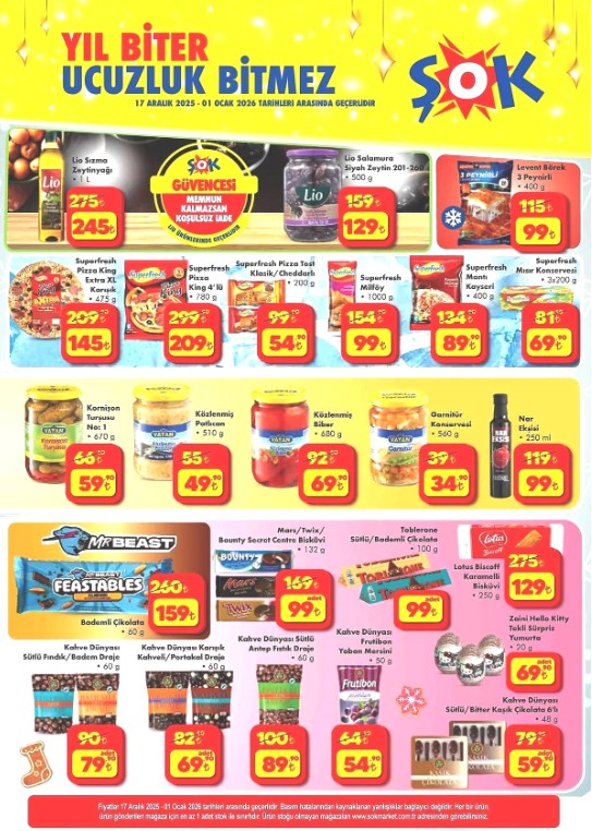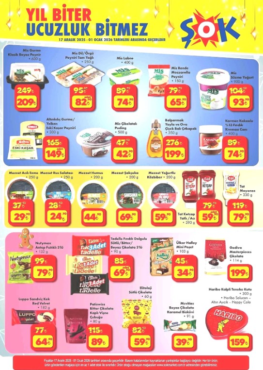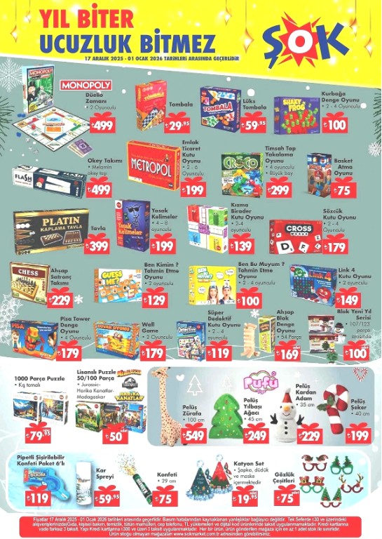 ŞOK market, 17 Aralık 2025 – 1 Ocak 2026 tarihleri arasında geçerli yeni aktüel ürünler kataloğunu yayımladı. Yıl sonuna özel hazırlanan kampanyada kutu oyunlarından gıdaya, ev ürünlerinden kişisel bakıma kadar birçok ürün indirimli fiyatlarla satışa sunuluyor.