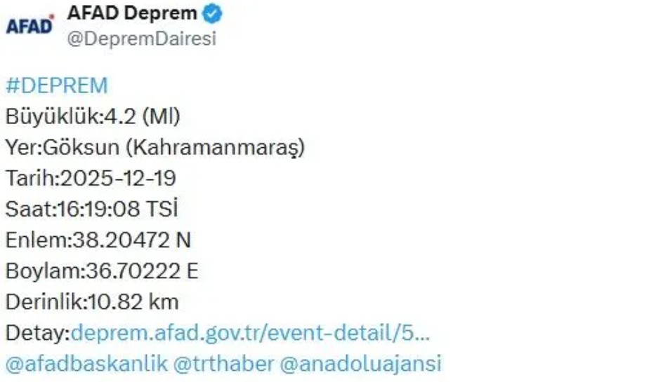 Afet ve Acil Durum Yönetimi Başkanlığı (AFAD) verilerine göre, Kahramanmaraş’ta 19 Aralık 2025 günü öğleden sonra hissedilen bir deprem kaydedildi. Göksun ilçesi merkezli sarsıntı çevre yerleşimlerde de hissedildi.