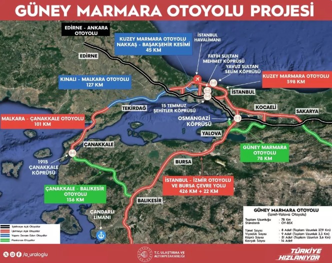 Güney Marmara Otoyolu’nun teknik detaylarını paylaşan Bakan Uraloğlu, projenin toplamda 78 kilometre uzunluğunda olacağını açıkladı. Buna göre: